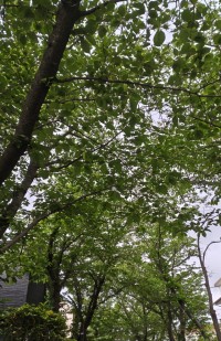 中門の桜も入学式・始業式の満開(2枚目の画像)から葉桜を経て、すっかり若葉の美し...