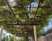 校庭の藤棚の藤の花が咲き誇っています。若葉が繁り、よい日陰にもなっています。これ...