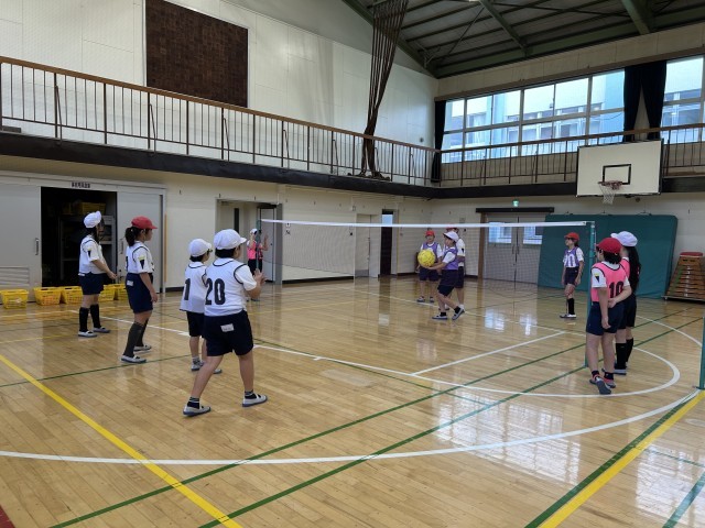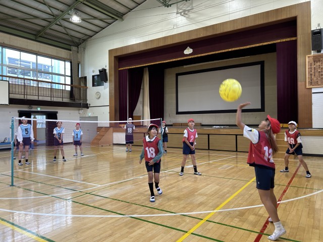 ソフトバレーボールの学習が進んでいます。チームごとの練習では、「いいね!」「ナイス!」など声がたくさん聞こえてきます。試合でも、チームで協力してボールをつなげるように頑張っています。