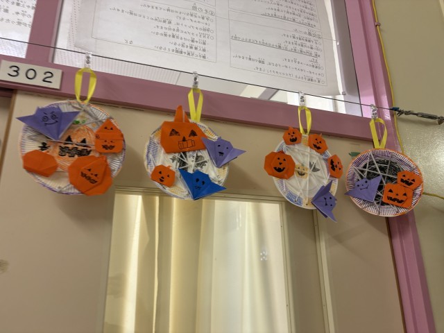 毛糸と紙皿で蜘蛛の巣のリースを作り、そこに折り紙で飾り付けをしました。