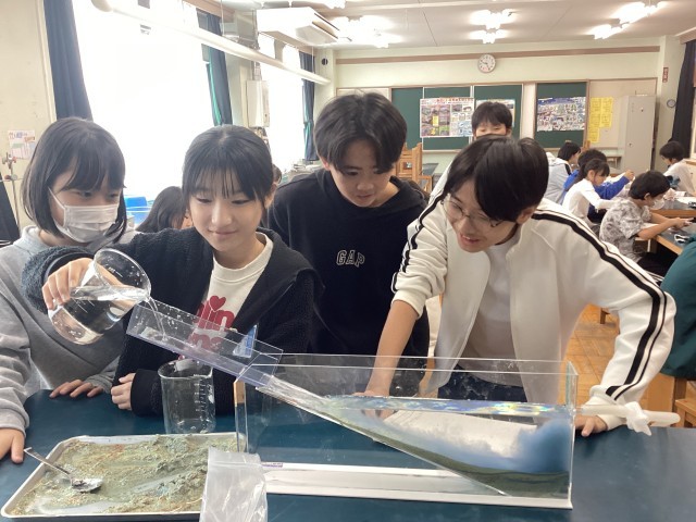 【6年生】理科 公開日 2025/10/31 更新日 2025/10/31 南小トピック 「地層はどのようにできるのか」という問題から、流れる水のはたらきとの関係を実験しました。地層は積み重なってできることを理解できました。