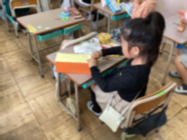 箱と箱を組み合わせて、滑り台や車など、思い思いのものを作りました。