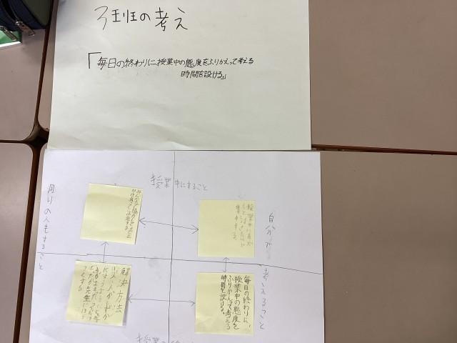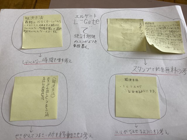 よりよい学校生活を送るために学級で「授業の取り組み」について現状や問題点、解決方法、理由や根拠を付箋に書いて班で考えをまとめる話し合いを行いました。早速、意識して取り組んでいました。さすが5年生!