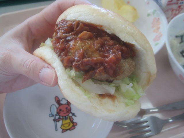 今日の給食は、自分で作るセルフハンバーガーです。半分に折りたたんだような形のパンを開いて、間にハンバーグとキャベツを挟んで食べます。