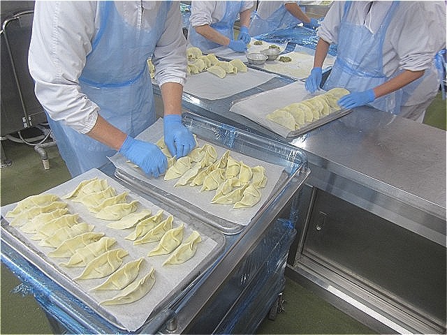 給食室では、大量のひき肉に野菜や調味料などを練り合わせて餃子のタネを作り、1つずつ丁寧に手作業で包みました。