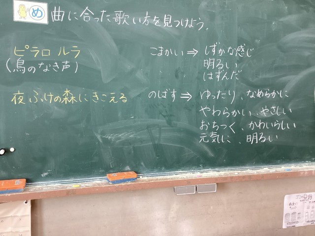 3年生は、「森の子もり歌」の学習に取り組んでいます。「『子もり歌』のイメージとは違う感じの曲だね。「楽しい曲だね」といった感想が、初めて歌ったときには聞かれました。今日は、そこから一歩踏み込んで「曲にあった歌い方」についてみんなで話し合い、実際に歌ってみました。曲から感じ取ったことを、少しずつ自分の言葉で表現できるようになると、歌声や演奏でも表現していけそうですね。