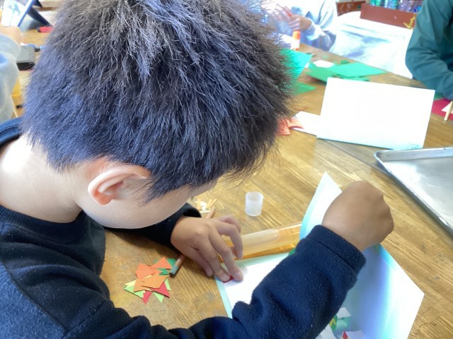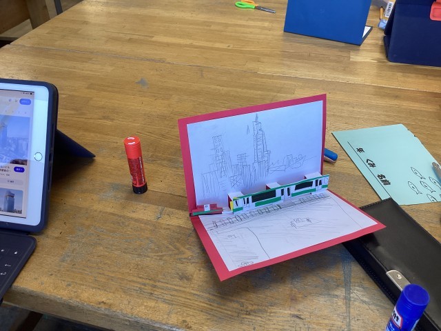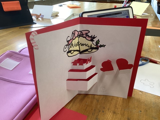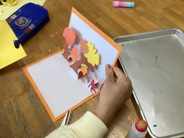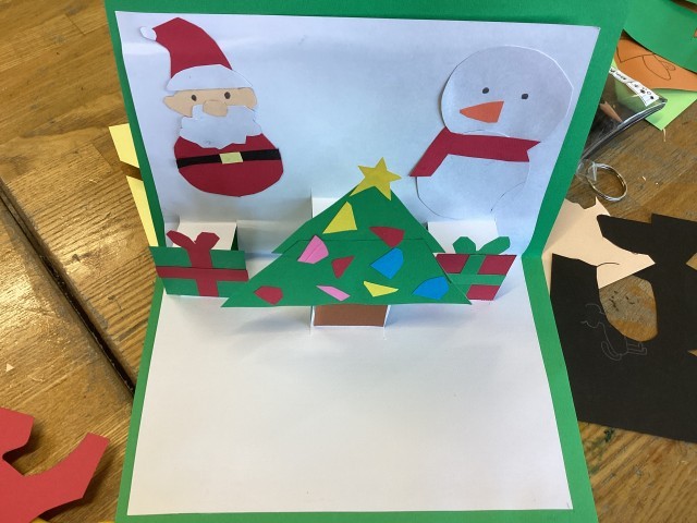 飛び出す仕組みを工夫してハッピカードをつくりました。日頃の感謝の気持ちを込めてお家の方や友達、先生などそれぞれ贈りたい人への思いをもって楽しく取り組みました。