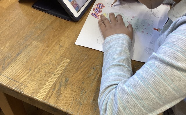 掲示委員会では、毎月の行事をお知らせするカードを作成しています。まず、今月の行事を確認して、何をお知らせするかグループごとに相談します。その後、みんなに伝わるようにレイアウトを工夫したりイラストを入れたりしながら、丁寧に作成します。校内の掲示板に注目してください!
