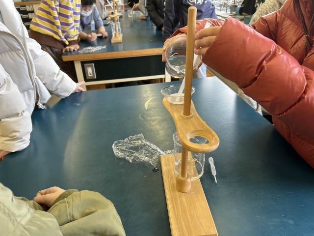 砂糖水や食塩水などを濾過する実験を行いました。班で協力して取り組むことができました。