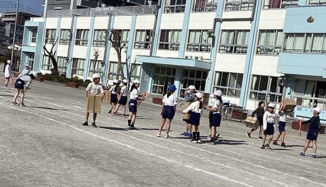 3年生は体育で、小型ハードル走に取り組んでいます。リズムよく走り越すためにはどうしたらいいか考えながらグループで話し合ってコースを作ります。跳ぶときの踏み切り足や、跳び越す高さのことなどが、コツとしてみんなの中から意見として出てきました。もちろん片付けも、みんなで協力して行っています。