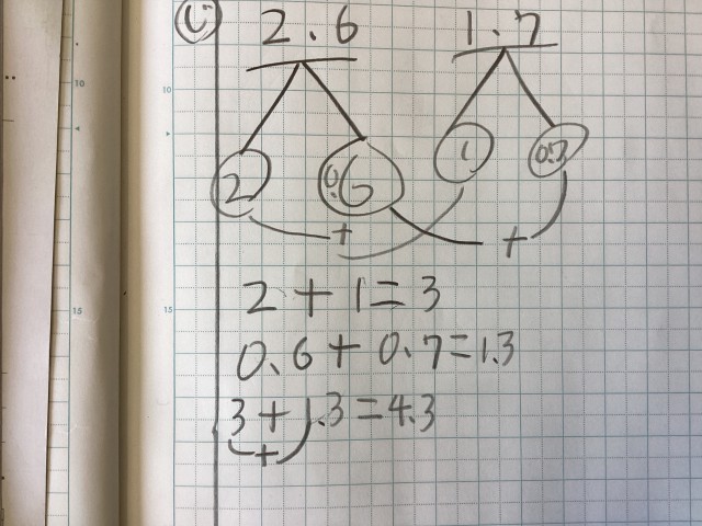 3年生は、算数で小数の学習に取り組んでいます。整数や分数でも計算できるんだから、小数でもできるはず・・・。とみんなで考えました。0.1を基にして考えたり、位ごとに分けて考えたりすることで、小数の計算の仕組みがわかってきましたね。