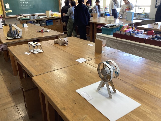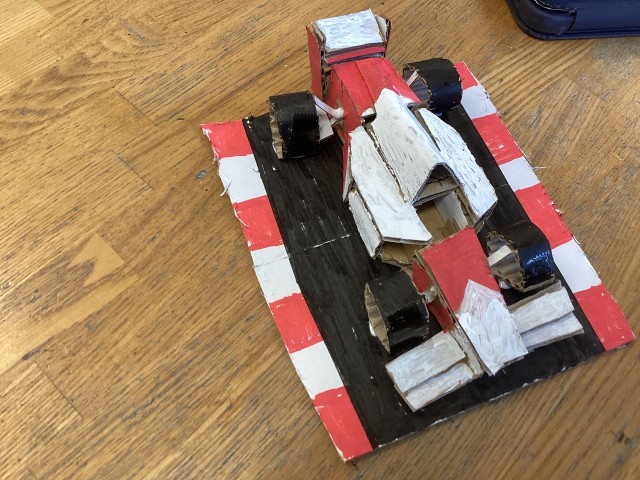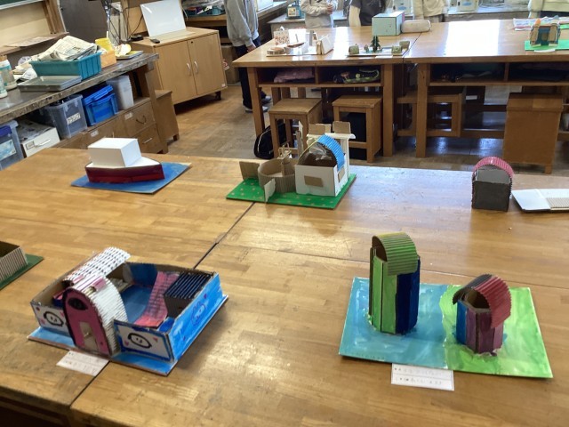 ダンボールを切る、曲げる、剥がすなど様々な技法を試して、思いついたものを形にしました。思い出の場所のメリーゴーランドや風車、車、家などみんなの思いを楽しく表現することができました。