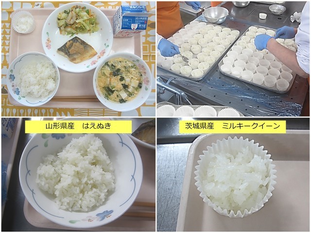 給食では、南葛西小学校のいつもの給食で食べている「山形県産はえぬき」と味わいの違う「茨城県産ミルキークイーン」の食べ比べを行いました。