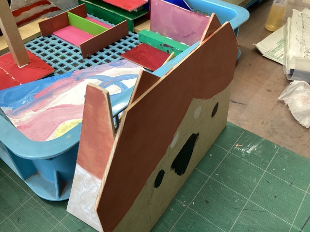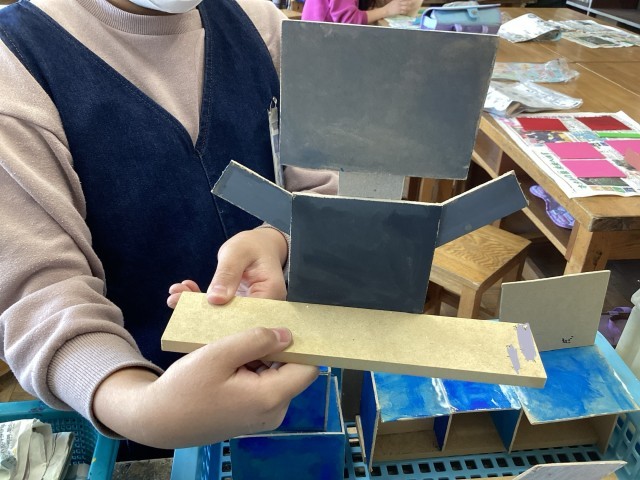ノコギリを使った板材の切り方や、切った側面を紙やすりで磨くなど木工作の工程について学習し、色塗りや形の組み合わせ方を工夫してつくりました。