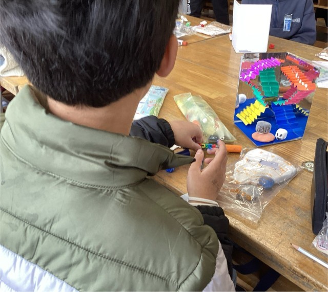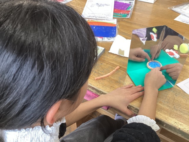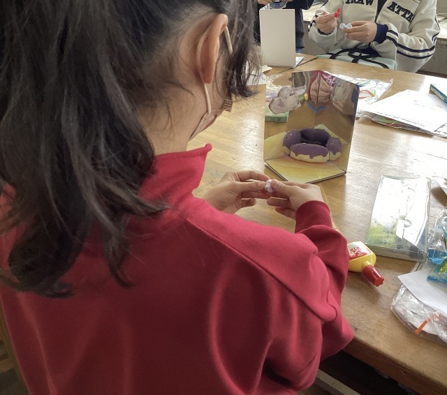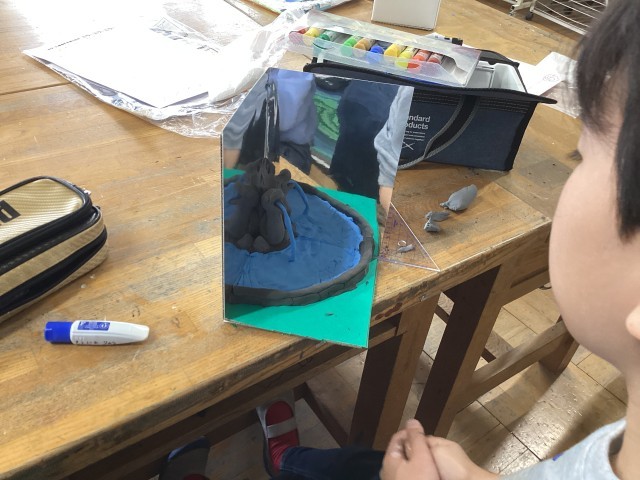 5年生の図工では、鏡の奥行きや反射を利用した不思議な世界をさまざまな材料を使って取り組んでいます。自分の思い描く「夢の世界」が鏡の中にどう広がるか、試行錯誤しながら制作しています。みんなの作品が完成するのがとても楽しみです。