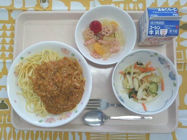 (実際の給食では、りんごの代わりにさくらの形のパスタを使って表しました。)