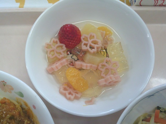 ・新学期フルーツポンチは、3学期なので普通のフルーツポンチではなく、さくらの形をイメージしたりんごなどを入れて「自分達がお兄さんお姉さんになるぞ!」と思えるようなフルーツポンチを考えました。