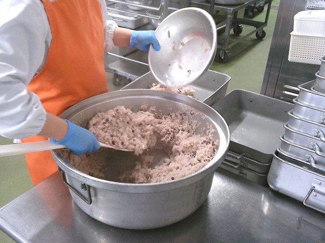 今日の給食は、6年生の卒業・1から5年生の修了をお祝いしてお赤飯を作りました。