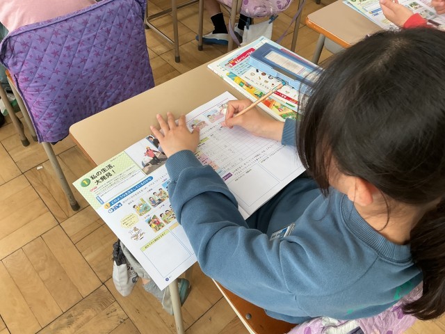初めての家庭科では、「家事」について、家族でどのような分担をしているかを考え、お家の人がさまざまなことをしている事と自分がほとんどしていないことに気づいた児童がたくさんいました。