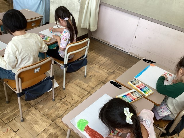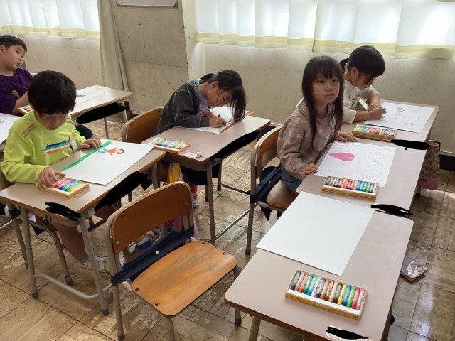 初めての図工の授業で好きなもの・好きなことの絵を描きました。クレヨンを使って元気いっぱいに表現することができました。