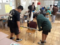 身のまわりのものを使って、新しい使い方を見つけ色紙をつくりました。トレーの上に画用紙を乗せ、絵の具のついたビー玉を自由に転がしました。両手でトレーを動かすことでビー玉がいろいろなところへ転がり、思いがけない形になりました。