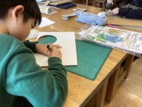 どこに何を置くか、水差しの使い方、パレットの使い方、色の足し算などを行いました。小学校での、初めての絵の具の授業をとても楽しんでいました。水浸しになった水道は最後にきちんと掃除しました。