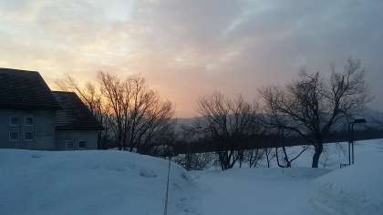 ウインタースクール2日目の朝です。6時30分起床。外を見ると、ちょっと晴れているようですが、気温はマイナス2度。天気予報では1日くもり、最高気温の予想は3度。少し寒いようです。