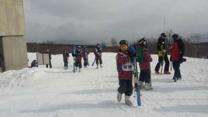 まず、ブーツの履き方を教わり、その後スキー板とストックを持って外に出ました。