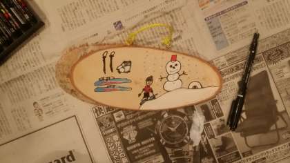 まず、白樺の木片の表面と裏面を紙ヤスリでツルツルになるまで磨きます。その後、サインペン等でウインタースクールの思い出を描きます。最後に、ヒートンと紐を付けると完成。