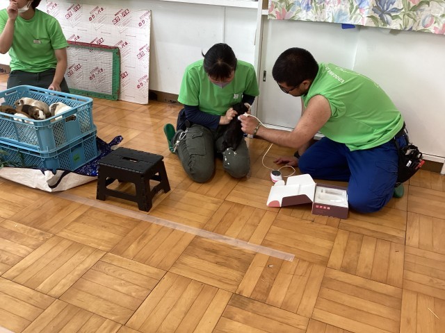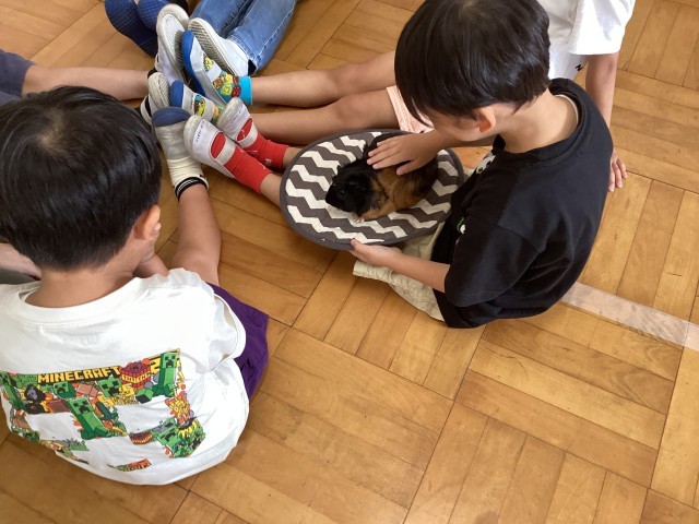 江戸川区自然動物園から、モルモットがやってきました。モルモットの体について教わった後、触ったり心臓の音を聞いたりして、生き物と仲良くなりました。