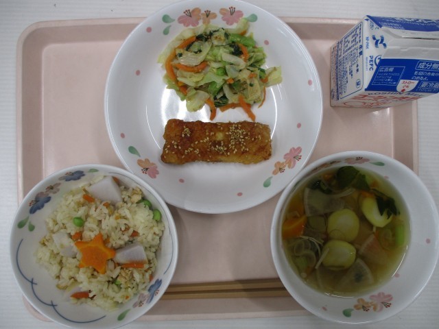 ちなみに6日(月)は、十五夜献立でした。(里芋ご飯、イカの竜田揚げ、野菜のごまみそ和え、月見汁)