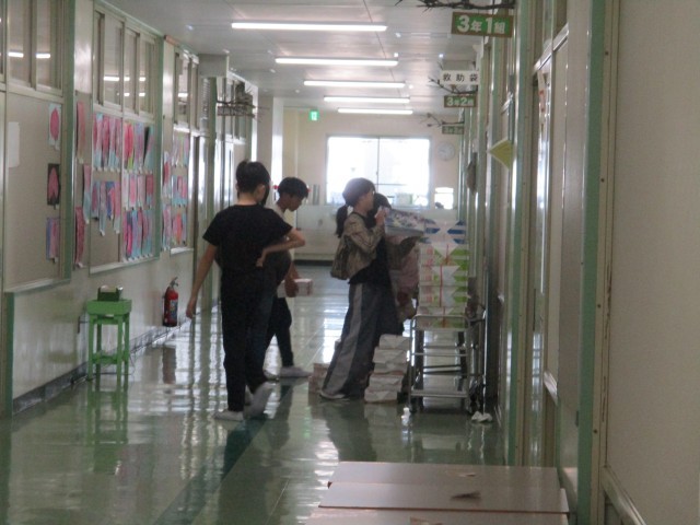 写真とともにこれまでの日々を振り返ってみます。①6日の入学式・始業式前、廊下・階段に美しい桜の絵が張られ、みんなを待っています。②前日準備では、新6年生が一年生の教室の飾りつけや、各教室への教科書運びを息をはずませながら一生懸命、取り組んでくれました。