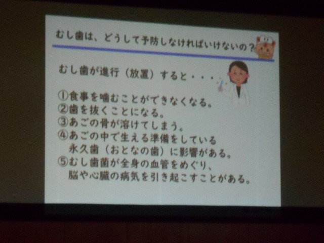 スライドや動画を使って、フッ化物洗口の意義や方法を説明してくれました。