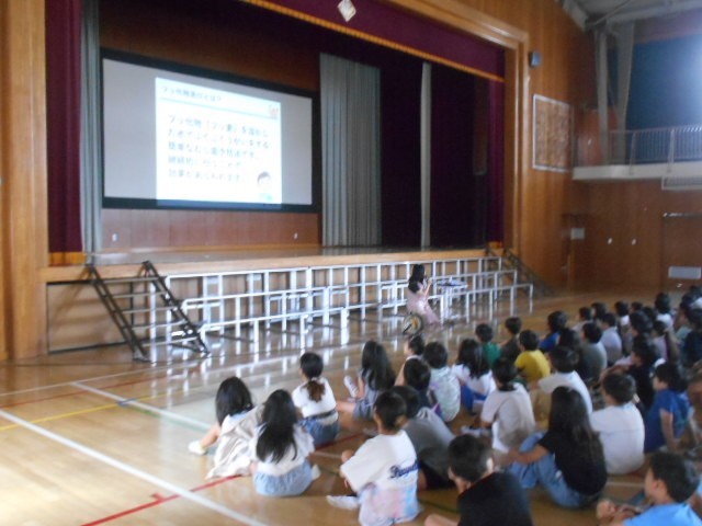 10月28日(火)からのフッ化物洗口の開始に向けて、全校朝会で養護の森先生から子供たちに説明がありました。