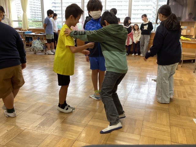 ある班では、じゃんけんで負けた人が、自分が乗っている新聞を半分に折る「新聞じゃんけん」を行っており、楽しそうに異学年交流をする様子が見られました。