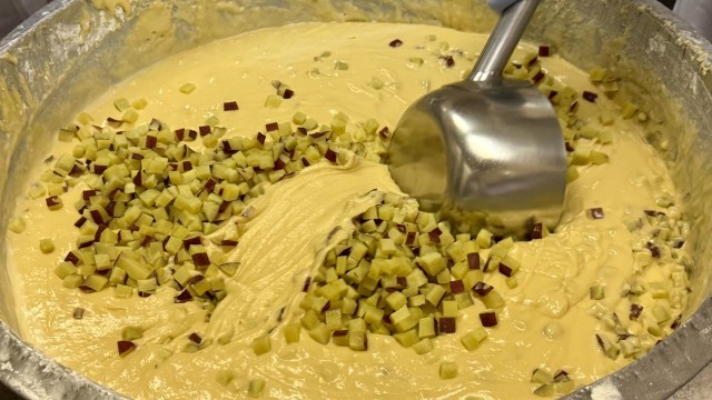 さつまいもケーキは、食べやすい大きさに切ったさつまいもを生地に入れて混ぜ、
