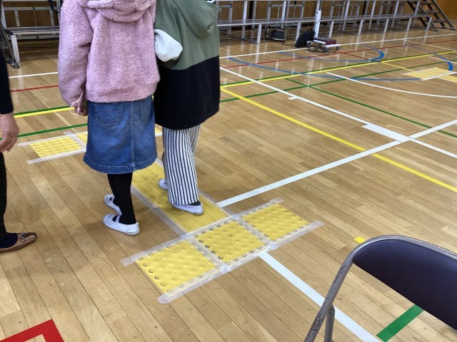 授業の後半には、視覚障害の方が日々どのように歩いているのか、それをサポートする方はどんな声掛けをしているのか、実際に体験しました。ペアを組み、一人はアイマスクをして視界を塞ぎ、もう一人が介助者となって体育館内のコースを歩きました。途中、点字ブロックの上に誘導して歩く様子もありました。