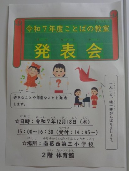 12月18日(木)にことばの教室では、年に1回の「発表会」を行います。通級児童が互いの成長を認め合ったり、人前で発表する経験を積んだりすることをねらいとしています。発表内容は担当と相談して決めました。得意なことや好きなこと、今頑張っていることだけでなく、あえて苦手なことに挑戦し自信をつけたいという思いをもって臨む児童もいます。どの子もこれまでの練習や準備の成果を発揮し、一回り大きく成長できたということを自分で実感することができる機会になれば良いなと思います。またその姿を保護者の方にも見ていただければと思います。