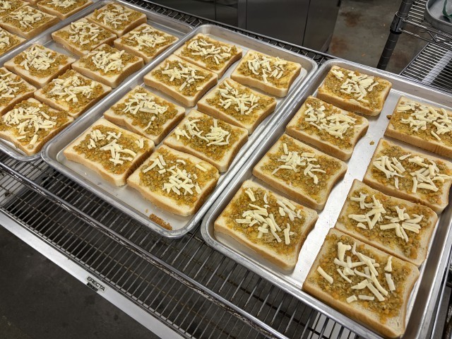 できた具をパンに乗せて、さらにチーズを乗せて焼きます。