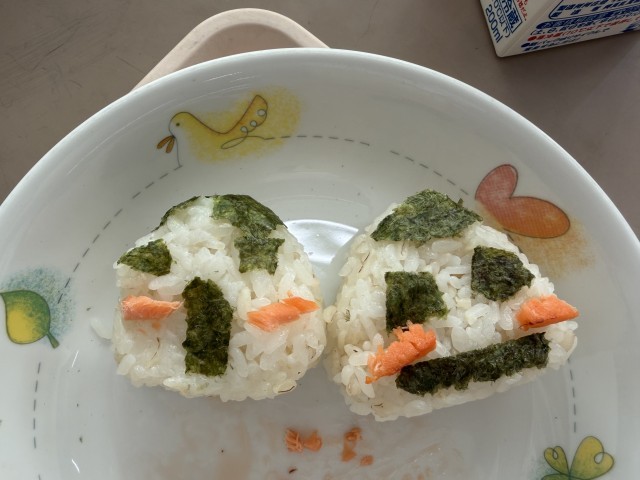 おにぎりと鮭の塩焼きを組み合わせて、かわいいオリジナルおにぎりを作っている児童もいました。