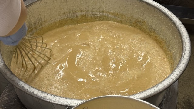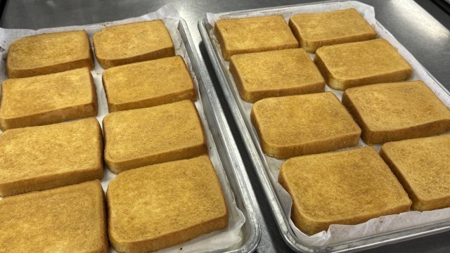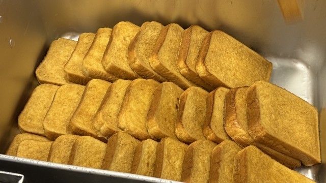 フレンチトーストのように、豆乳・卵・キャラメルパウダー・きなこ・さとうなどを混ぜた液に浸してから焼いているので、中までしっとりしています。パンの耳まで食べやすくなっているため、おかわりをする児童が多くいました。