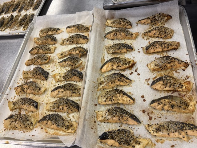 ③さけにごまを付けて焼くことで香ばしくなり、食べやすくしている。