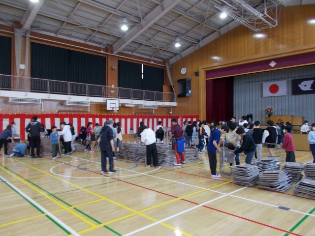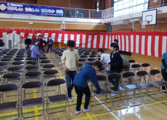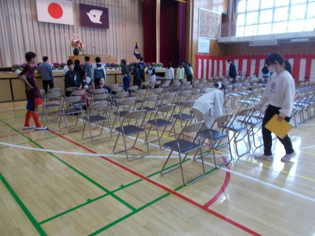 明日はいよいよ卒業式です。小学校生活の中で、一番大事な式とされています。今日は、5年生と先生方で卒業式の準備をしました。今まで、学校のためにがんばってきてくれた6年生を、気持ちよく送り出せるように一生懸命準備をしました。椅子は縦横しっかり揃っているか、汚れていないか、細かいところまでよく見て取り組みました。