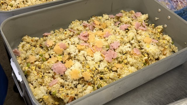 ちらし寿司には、マスや桜の形のかまぼこをちらしています。