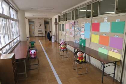 「緊急事態宣言」発令の際に専門家から指摘された「接触8割削減」を目指し、現在約6割の教員が自宅勤務をしています。また、職員室内での感染リスクを下げるため、会話は禁止。どうしても打ち合わせが必要なときは、窓を開けた廊下か2階のベランダに出て話しています。写真は廊下の打ち合わせスペース。合言葉の「パンダ一頭分(約2m)」離れるようにいすを配置しました。さらに、職員室内の人口密度を少しでも下げようと、家庭への電話連絡は廊下に設置した電話機から行っています。5月7日の学校再開に向けて、やれることは全部やります!