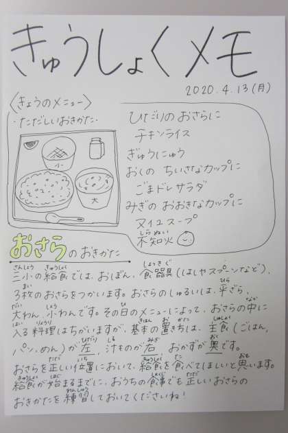 お休(やす)み中(ちゅう)におうちでごはんを食(た)べるときも、お皿の置きかたを考(かんが)えて食べましょう!