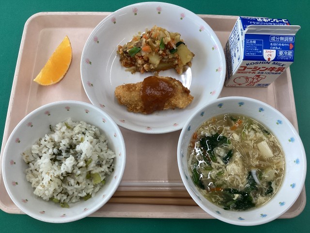 今日の献立わかめご飯、豚汁、ちぐさ焼き、ポップビーンズ、大根のそぼろ煮、牛乳です...