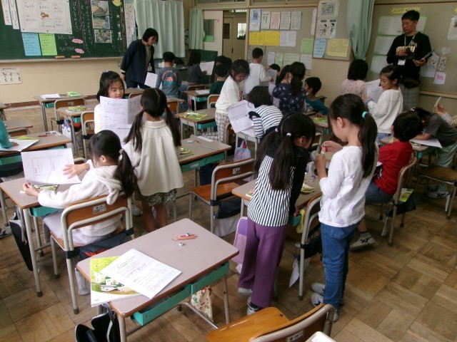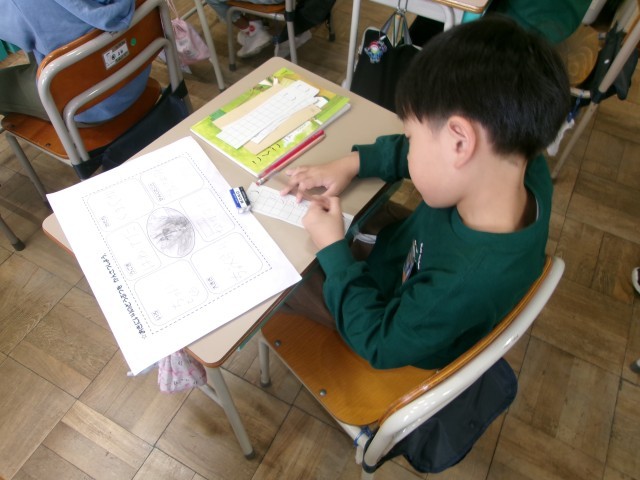 生活科見学で観察した動物について、色や形、大きさなどを入れて文章の下書きをしました。書いたことを伝え合い、内容を深めていました。