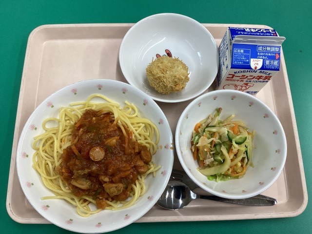 マンハッタンクラムチャウダーパスタ、ポテしゃきサラダ、いがぐりあげ、牛乳です。