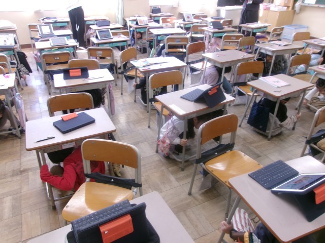 大きな地震を想定した予告なしの訓練でした。どの学年も、「おかしも」(おさない・かけない・しゃべらない・もどらない)を守って、安全に避難できました。すばらしい態度でした!